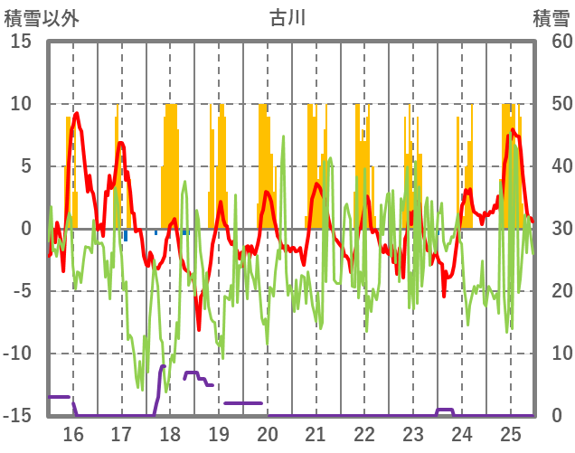| 日 | 時 | 気温 | 降水 | 風向/風速 | 日照 | 積雪 | 降雪 |