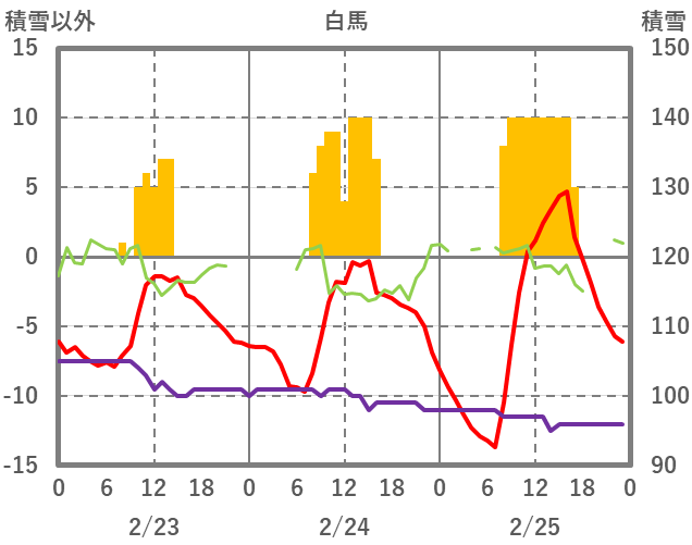 | 日 | 時 | 気温 | 降水 | 風向/風速 | 日照 | 積雪 | 降雪 |