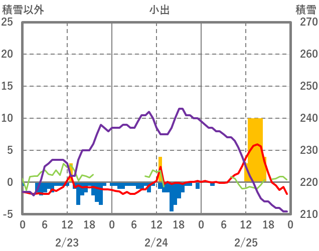 | 日 | 時 | 気温 | 降水 | 風向/風速 | 日照 | 積雪 | 降雪 |