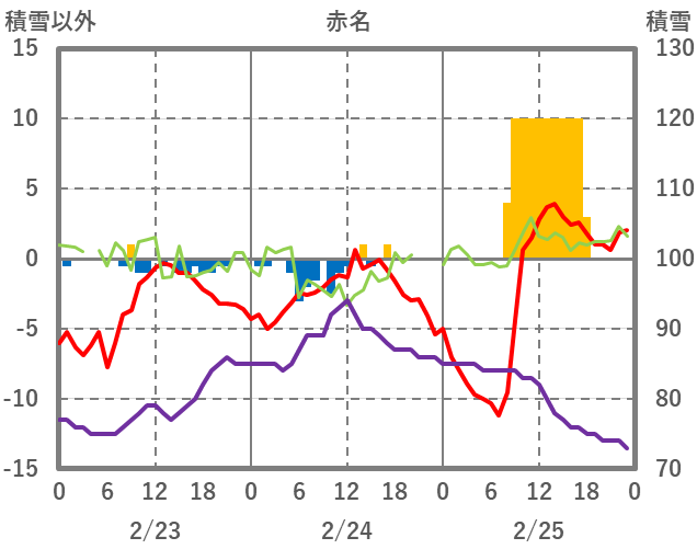 | 日 | 時 | 気温 | 降水 | 風向/風速 | 日照 | 積雪 | 降雪 |