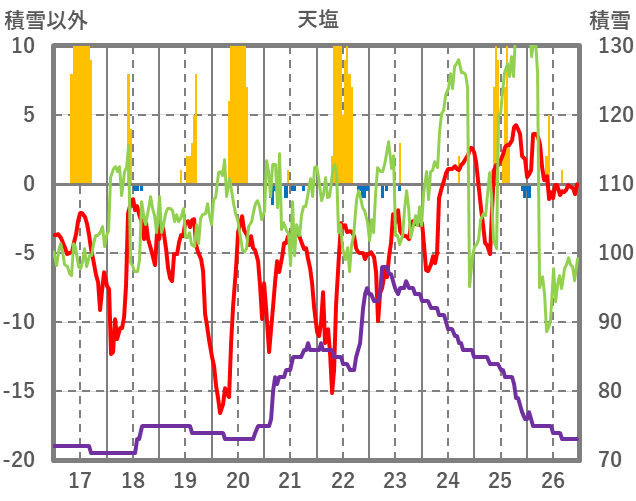 | 日 | 時 | 気温 | 降水 | 風向/風速 | 日照 | 積雪 | 降雪 |