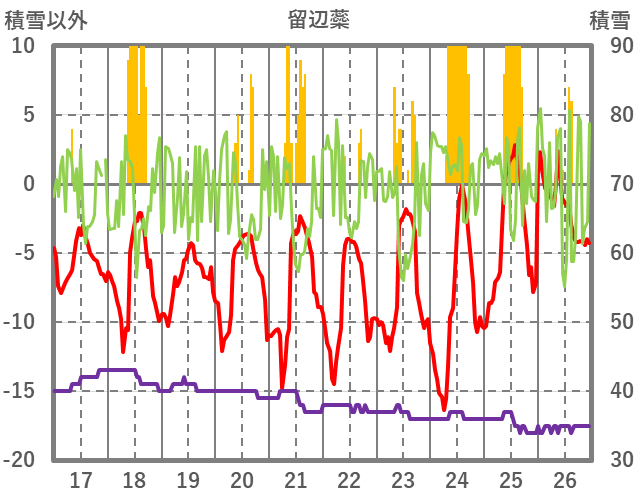 | 日 | 時 | 気温 | 降水 | 風向/風速 | 日照 | 積雪 | 降雪 |
