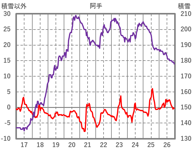 | 日 | 時 | 気温 | 降水 | 風向/風速 | 日照 | 積雪 | 降雪 |