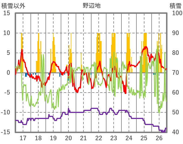 | 日 | 時 | 気温 | 降水 | 風向/風速 | 日照 | 積雪 | 降雪 |