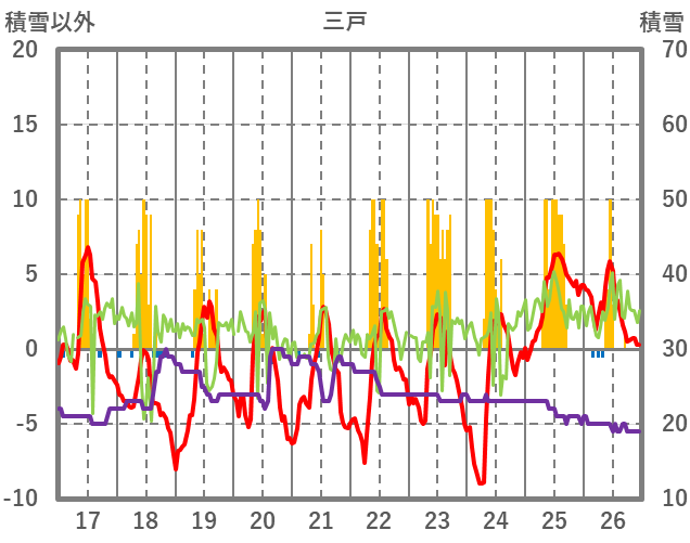 | 日 | 時 | 気温 | 降水 | 風向/風速 | 日照 | 積雪 | 降雪 |