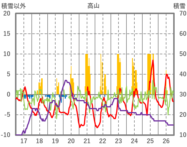 | 日 | 時 | 気温 | 降水 | 風向/風速 | 日照 | 積雪 | 降雪 |