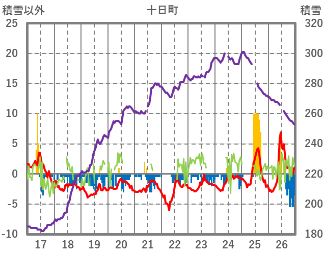 | 日 | 時 | 気温 | 降水 | 風向/風速 | 日照 | 積雪 | 降雪 |