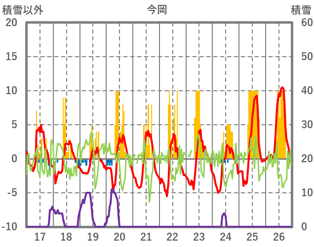 | 日 | 時 | 気温 | 降水 | 風向/風速 | 日照 | 積雪 | 降雪 |