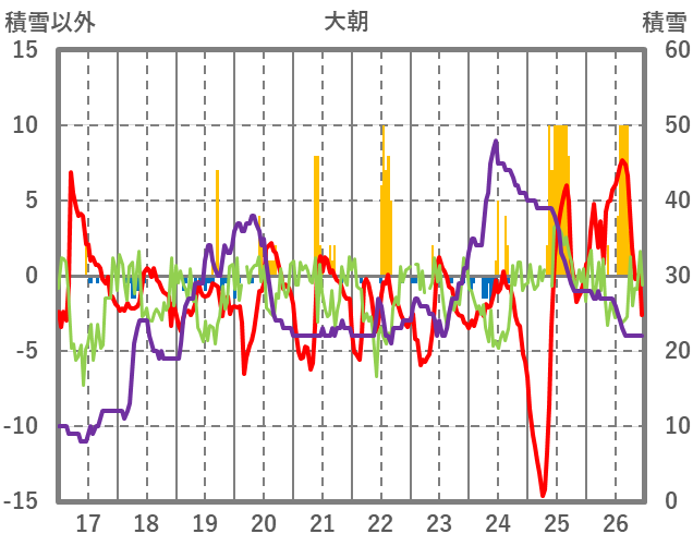 | 日 | 時 | 気温 | 降水 | 風向/風速 | 日照 | 積雪 | 降雪 |