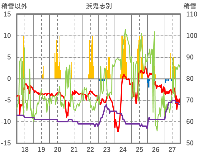 | 日 | 時 | 気温 | 降水 | 風向/風速 | 日照 | 積雪 | 降雪 |