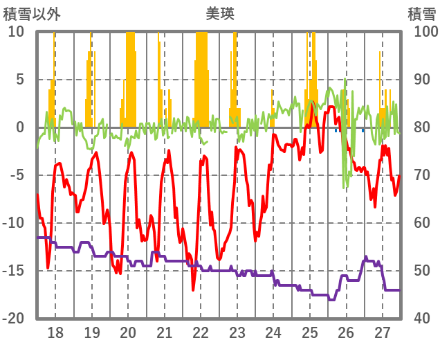 | 日 | 時 | 気温 | 降水 | 風向/風速 | 日照 | 積雪 | 降雪 |
