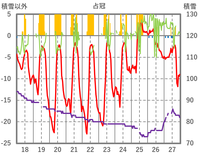 | 日 | 時 | 気温 | 降水 | 風向/風速 | 日照 | 積雪 | 降雪 |