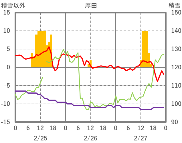 | 日 | 時 | 気温 | 降水 | 風向/風速 | 日照 | 積雪 | 降雪 |
