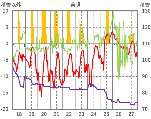 | 日 | 時 | 気温 | 降水 | 風向/風速 | 日照 | 積雪 | 降雪 |