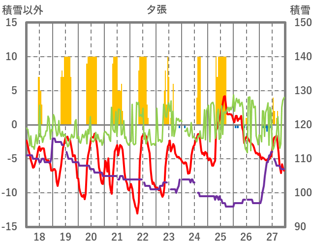 | 日 | 時 | 気温 | 降水 | 風向/風速 | 日照 | 積雪 | 降雪 |