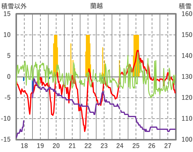 | 日 | 時 | 気温 | 降水 | 風向/風速 | 日照 | 積雪 | 降雪 |