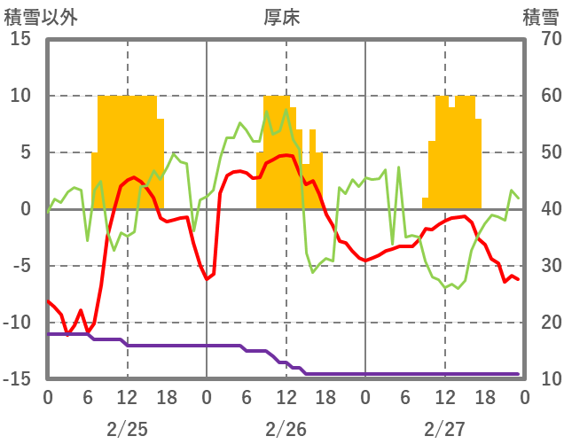 | 日 | 時 | 気温 | 降水 | 風向/風速 | 日照 | 積雪 | 降雪 |