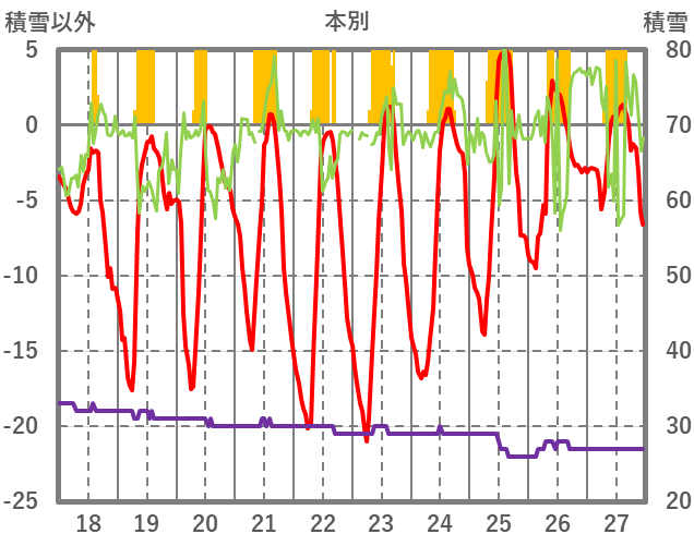 | 日 | 時 | 気温 | 降水 | 風向/風速 | 日照 | 積雪 | 降雪 |
