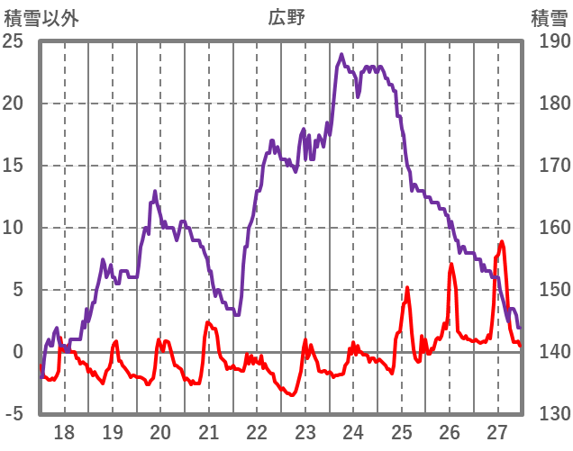 | 日 | 時 | 気温 | 降水 | 風向/風速 | 日照 | 積雪 | 降雪 |