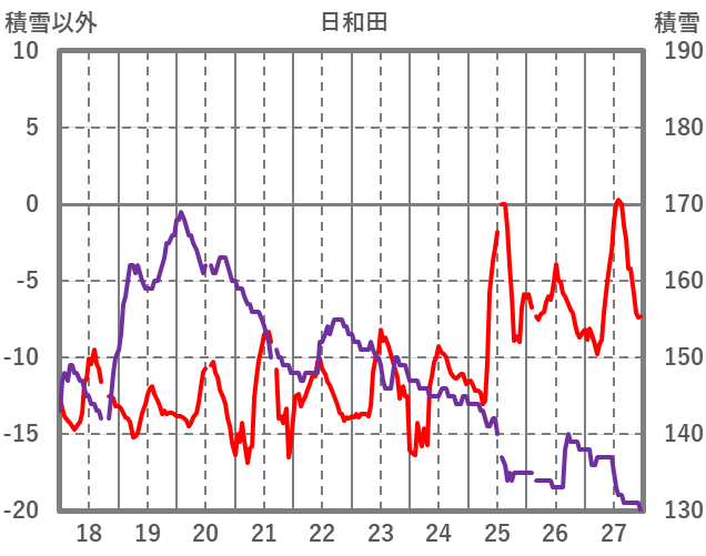 | 日 | 時 | 気温 | 降水 | 風向/風速 | 日照 | 積雪 | 降雪 |
