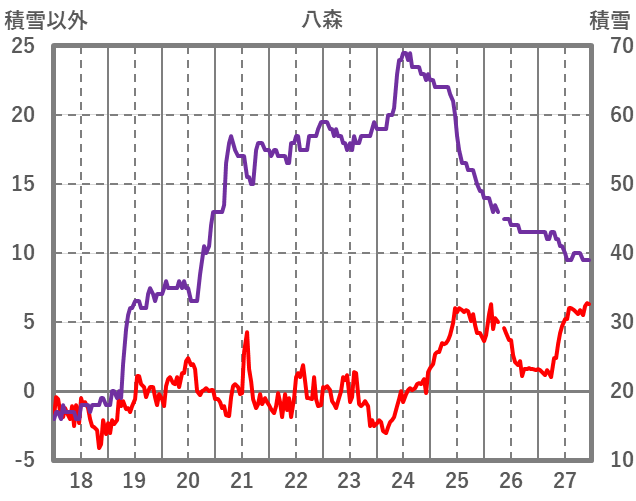 | 日 | 時 | 気温 | 降水 | 風向/風速 | 日照 | 積雪 | 降雪 |