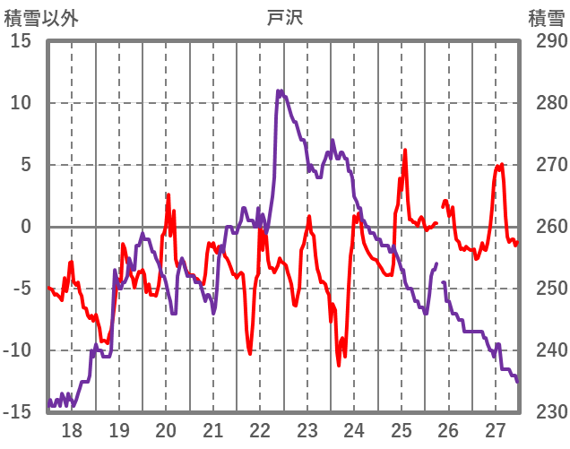 | 日 | 時 | 気温 | 降水 | 風向/風速 | 日照 | 積雪 | 降雪 |