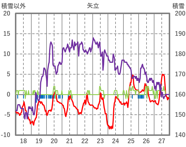 | 日 | 時 | 気温 | 降水 | 風向/風速 | 日照 | 積雪 | 降雪 |