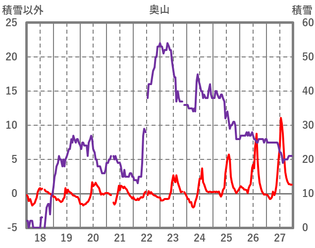 | 日 | 時 | 気温 | 降水 | 風向/風速 | 日照 | 積雪 | 降雪 |