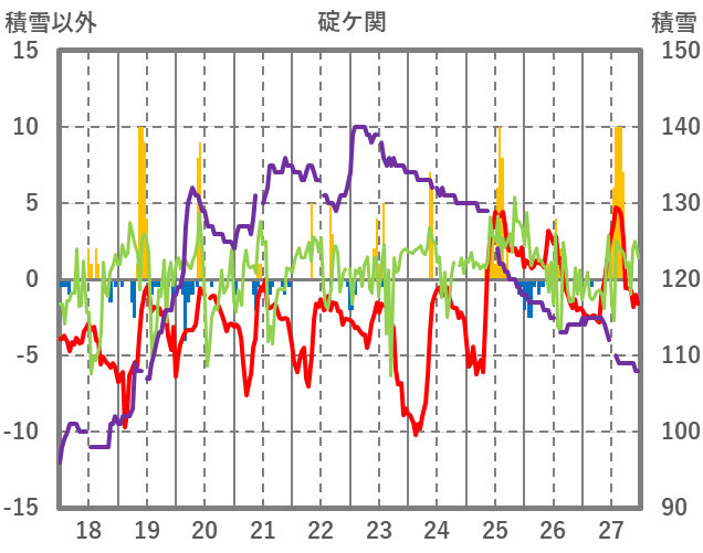 | 日 | 時 | 気温 | 降水 | 風向/風速 | 日照 | 積雪 | 降雪 |