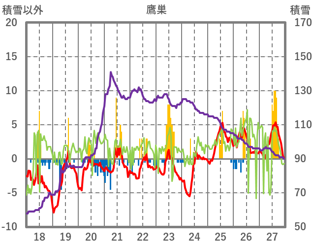 | 日 | 時 | 気温 | 降水 | 風向/風速 | 日照 | 積雪 | 降雪 |
