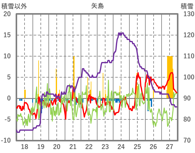 | 日 | 時 | 気温 | 降水 | 風向/風速 | 日照 | 積雪 | 降雪 |