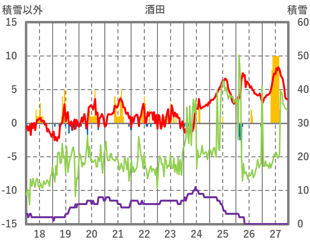 | 日 | 時 | 気温 | 降水 | 風向/風速 | 日照 | 積雪 | 降雪 |