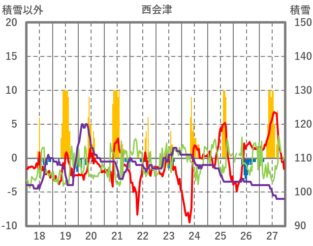 | 日 | 時 | 気温 | 降水 | 風向/風速 | 日照 | 積雪 | 降雪 |