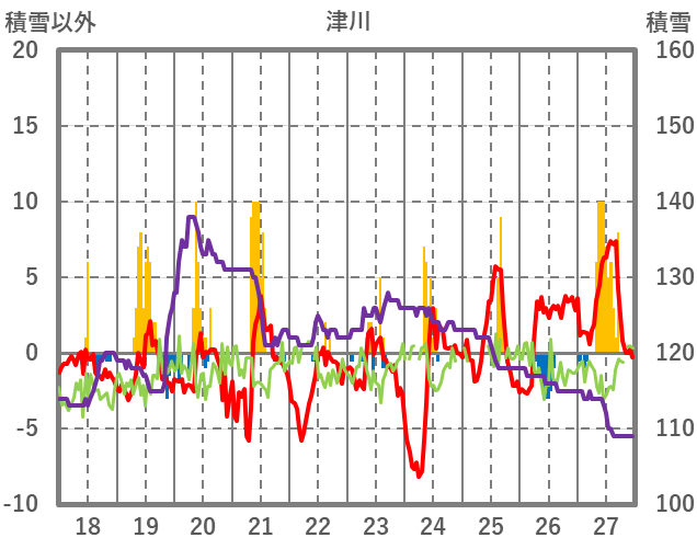 | 日 | 時 | 気温 | 降水 | 風向/風速 | 日照 | 積雪 | 降雪 |