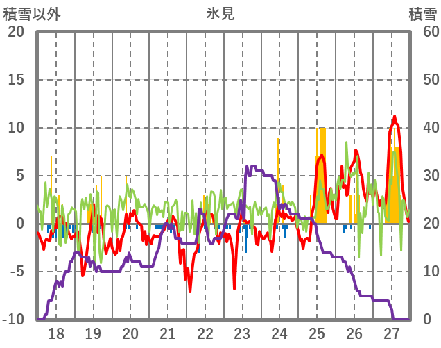 | 日 | 時 | 気温 | 降水 | 風向/風速 | 日照 | 積雪 | 降雪 |