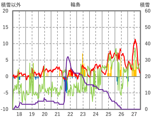| 日 | 時 | 気温 | 降水 | 風向/風速 | 日照 | 積雪 | 降雪 |