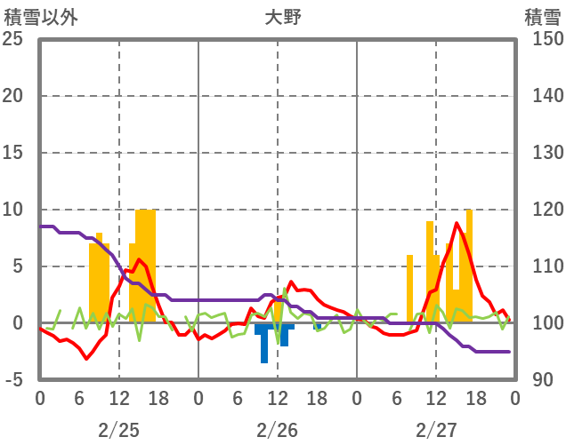 | 日 | 時 | 気温 | 降水 | 風向/風速 | 日照 | 積雪 | 降雪 |