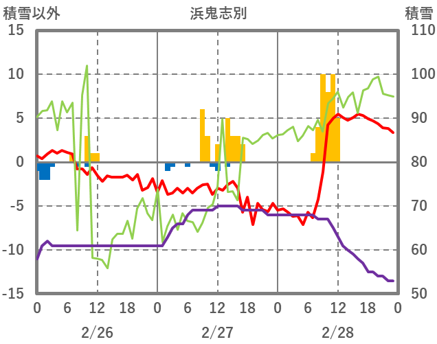 | 日 | 時 | 気温 | 降水 | 風向/風速 | 日照 | 積雪 | 降雪 |