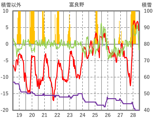 | 日 | 時 | 気温 | 降水 | 風向/風速 | 日照 | 積雪 | 降雪 |