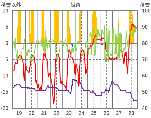 | 日 | 時 | 気温 | 降水 | 風向/風速 | 日照 | 積雪 | 降雪 |