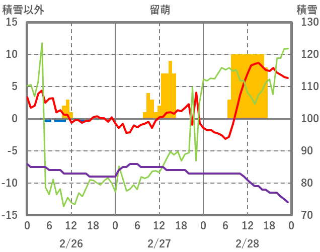 | 日 | 時 | 気温 | 降水 | 風向/風速 | 日照 | 積雪 | 降雪 |