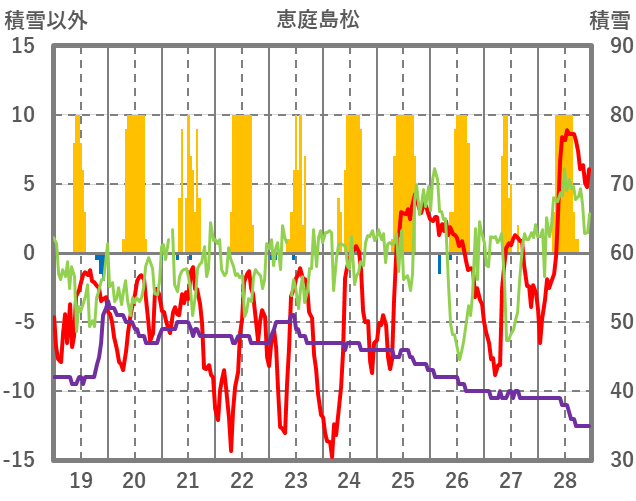 | 日 | 時 | 気温 | 降水 | 風向/風速 | 日照 | 積雪 | 降雪 |