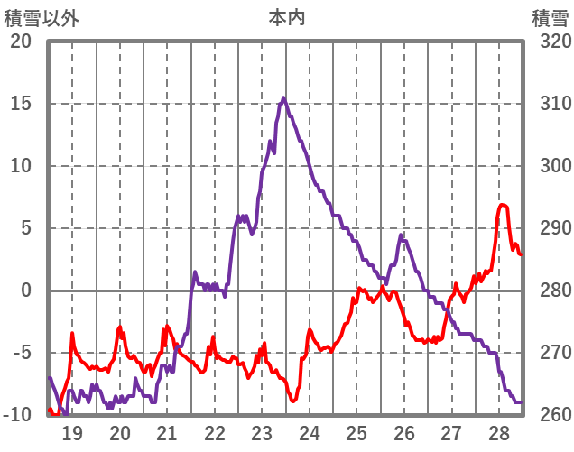 | 日 | 時 | 気温 | 降水 | 風向/風速 | 日照 | 積雪 | 降雪 |