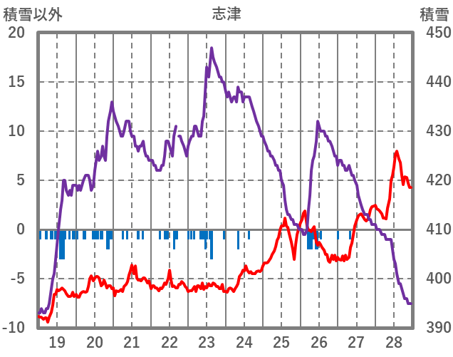 | 日 | 時 | 気温 | 降水 | 風向/風速 | 日照 | 積雪 | 降雪 |