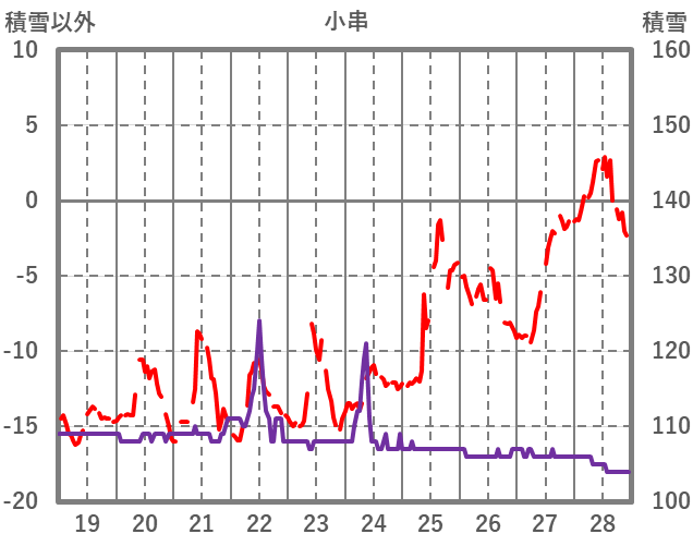 | 日 | 時 | 気温 | 降水 | 風向/風速 | 日照 | 積雪 | 降雪 |