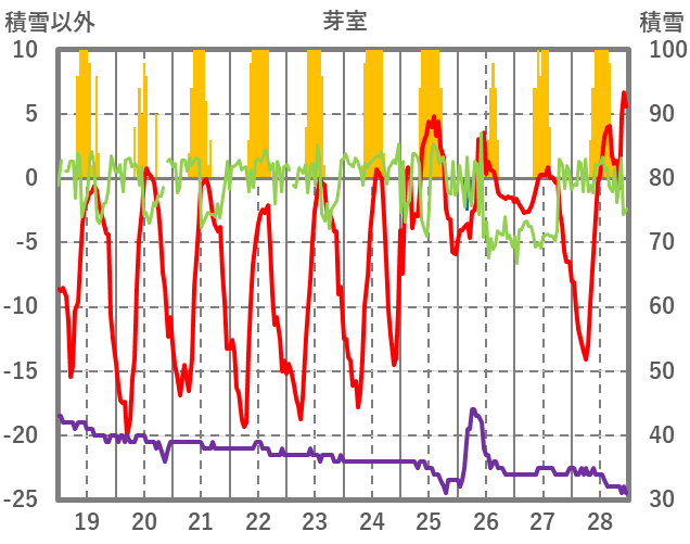 | 日 | 時 | 気温 | 降水 | 風向/風速 | 日照 | 積雪 | 降雪 |