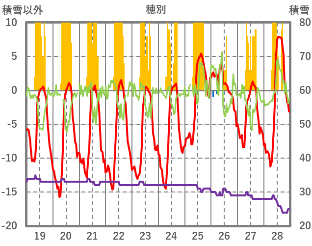 | 日 | 時 | 気温 | 降水 | 風向/風速 | 日照 | 積雪 | 降雪 |