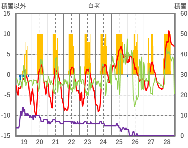 | 日 | 時 | 気温 | 降水 | 風向/風速 | 日照 | 積雪 | 降雪 |