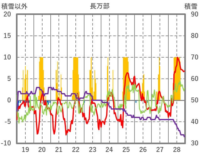 | 日 | 時 | 気温 | 降水 | 風向/風速 | 日照 | 積雪 | 降雪 |
