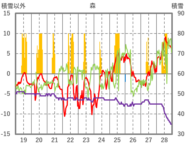 | 日 | 時 | 気温 | 降水 | 風向/風速 | 日照 | 積雪 | 降雪 |